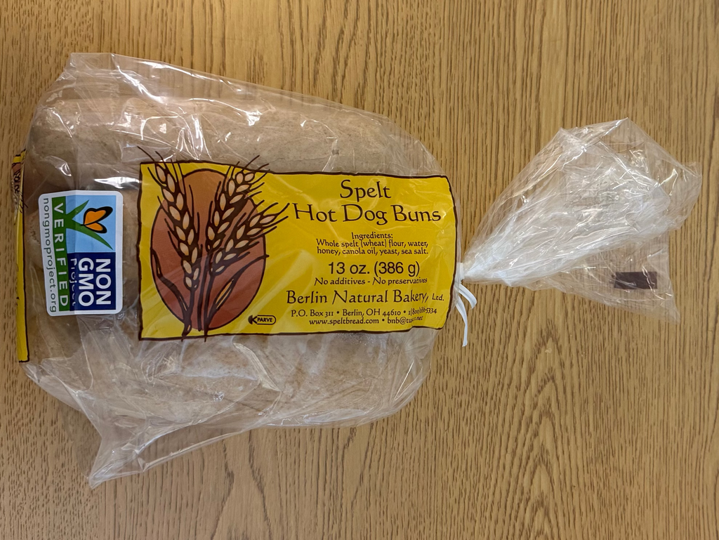 Ingredients: Organic Whole Grain Spelt flour, filtered water, Non GMO expeller pressed canola oil, honey, yeast, sea salt.